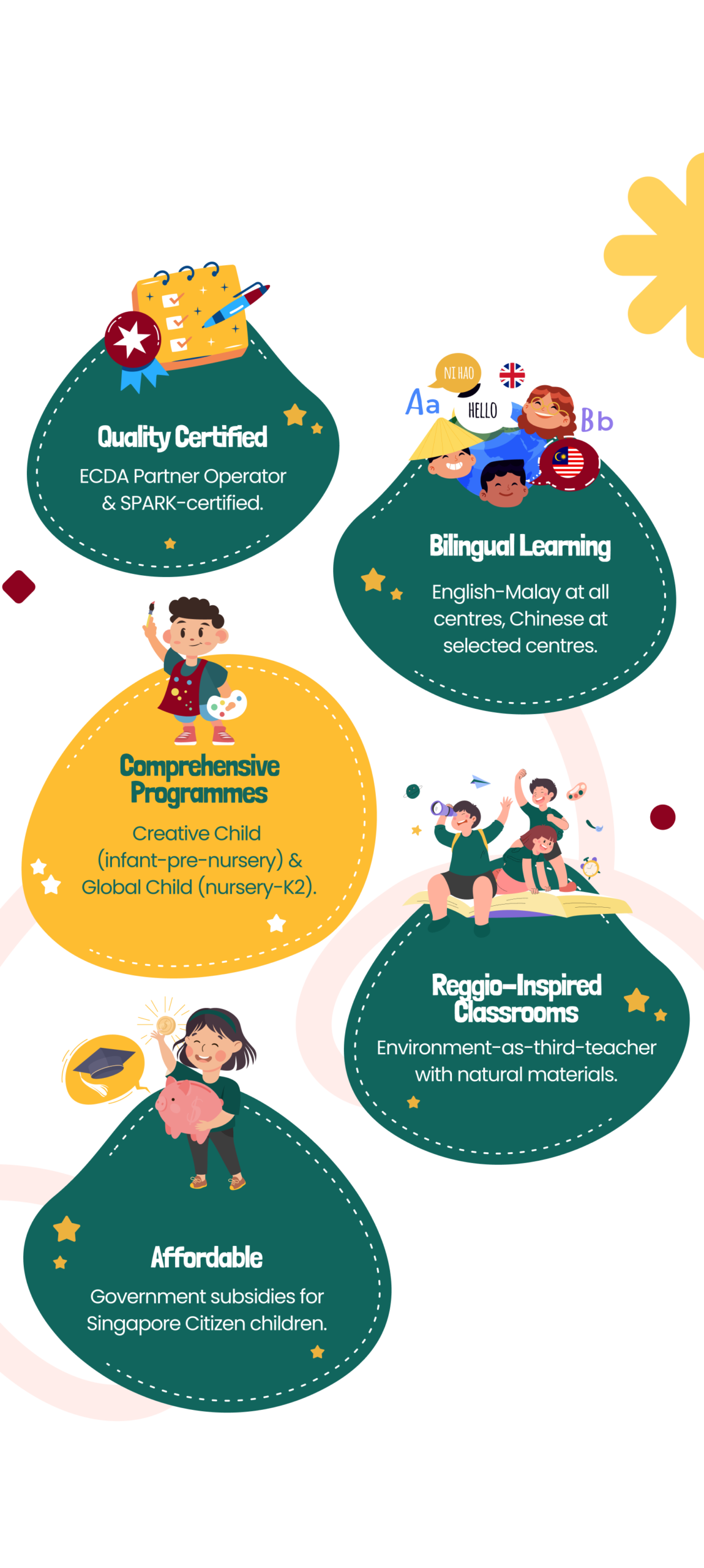 1. Promotion is valid for new child registrations and enrolments across all programmes (Infant Care, Playgroup, Pre-Nursery, Nursery, Kindergarten 1, and Kindergarten 2) at our centres at the following locations: